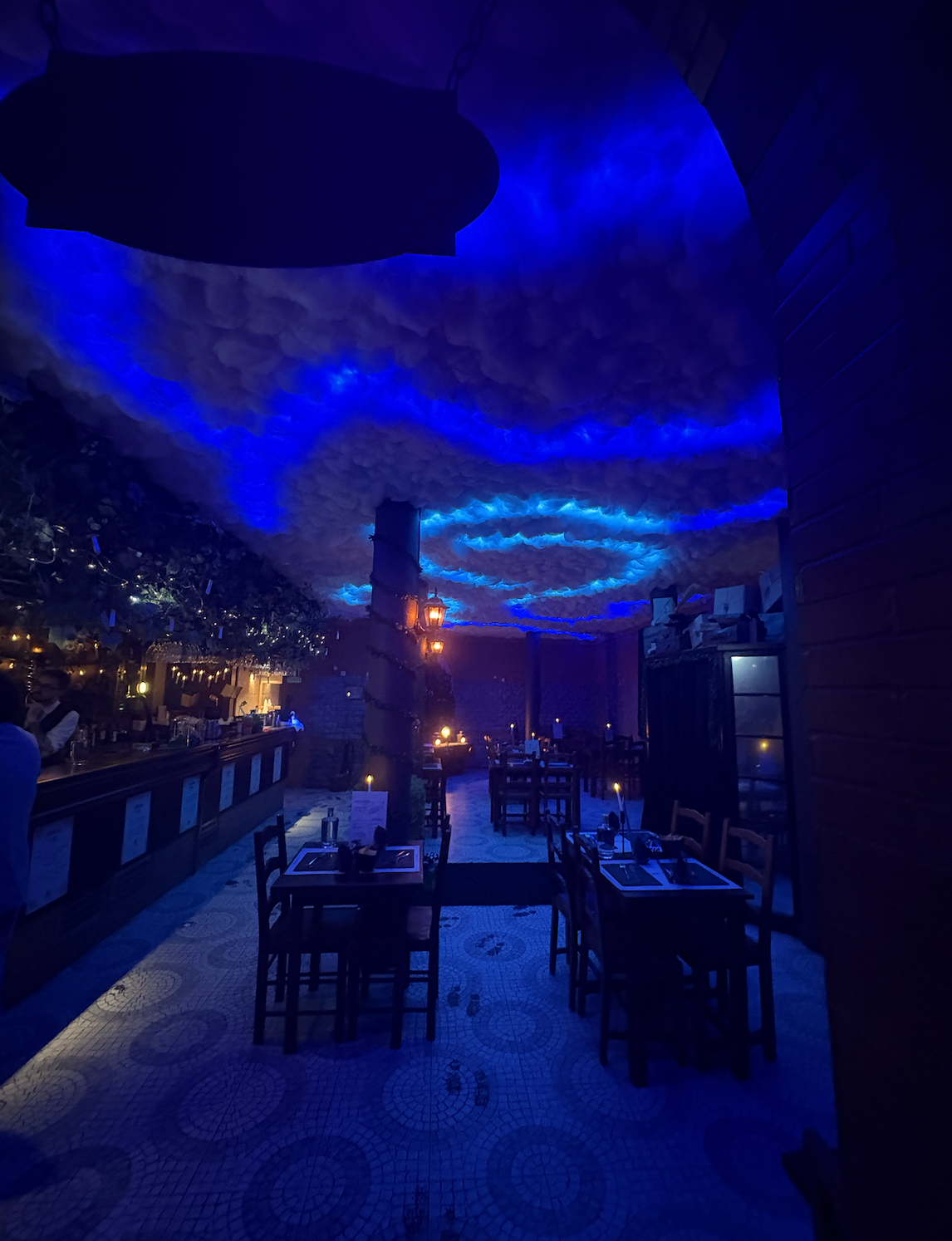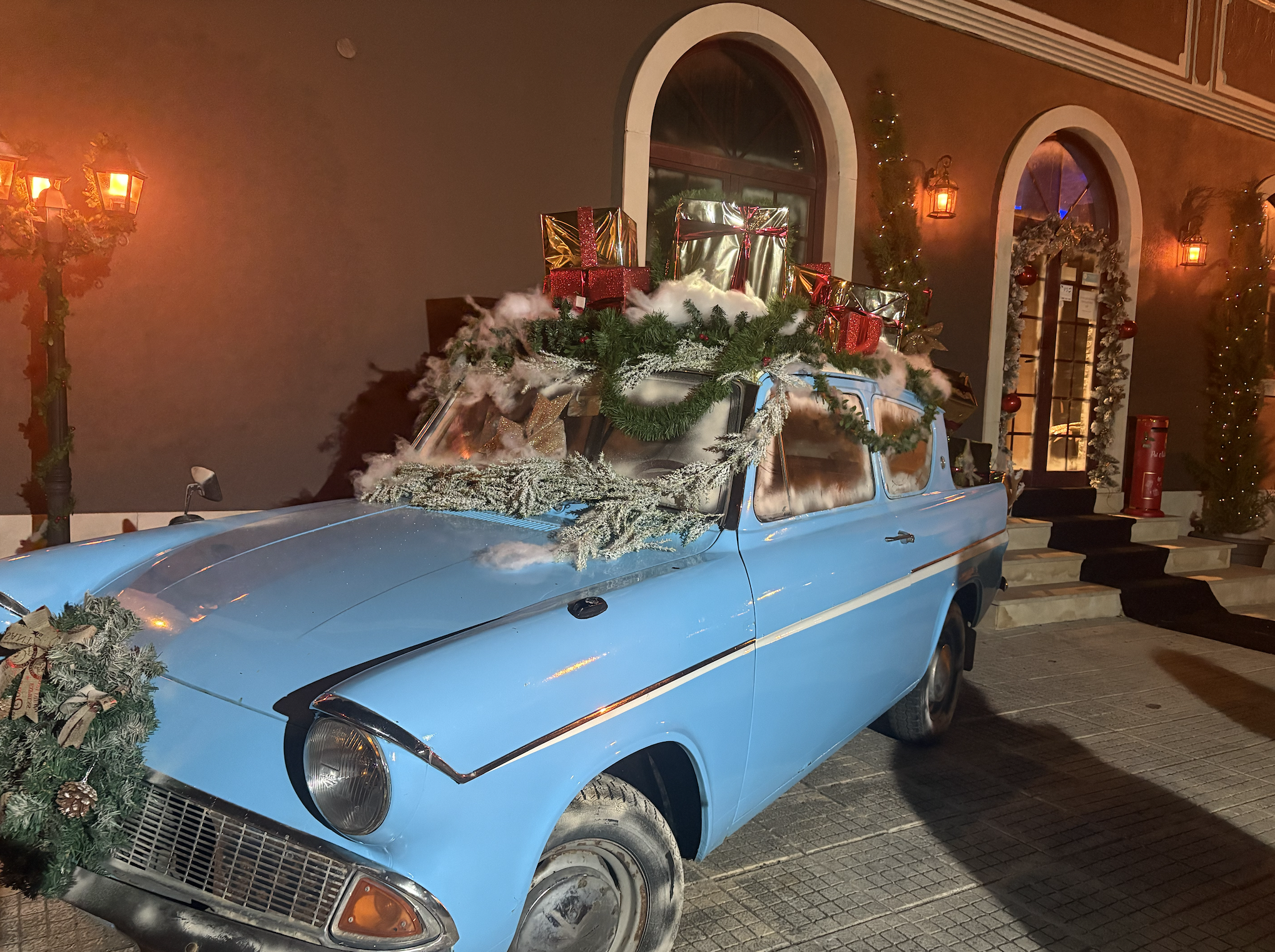 Your experience at Plataforma 9 3/4 (known as Plataforma.Rodizio on Instagram) begins with a role call at the front door by a “professor” dressed in a Hogwarts-like robe. The professor first asks the group of guests if they can remember a spell from Harry Potter to get the front door to open. When the group recites it all together, the door opens and then, just like being students at Hogwarts, each reservation is called, and guests are welcomed into the restaurant individually. A blue car, meant to resemble the Flying Ford Ford Anglia 105E Deluxe from Harry Potter and the Chamber of Secrets, sits just outside the entrance, which guests can pose with for photos with as they wait to be called. I visited during the Christmas season and the Flying Ford was decorated with presents and snow-dusted wreaths. The professor greeting us at the door also raised his wand into the air and “made it snow” before he called our names, quite a special touch when you’re in a part of Portugal that hasn’t seen snow since 2006.