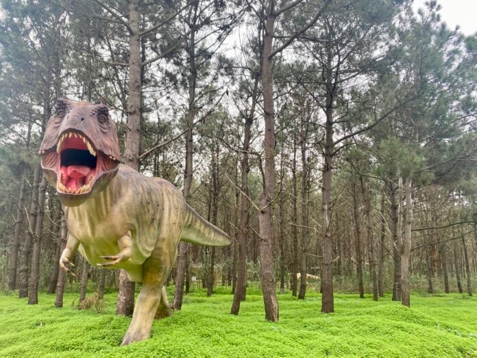 Once you exit the ticket office/gift shop and fossil exhibition areas, you emerge onto the edge of a large pine forest behind the main building where over 200 dinosaur models are positioned across six different zones starting in chronological order with the Paleozoic, Triassic, Jurassic, and Cretaceous periods. You can also do as I did and start with the Sea Monsters zone closest to the Dinosaur Exhibition and Museum. Ice Age opened in 2023 and features a display of a saber-toothed tiger and a woolly mammoth. Another zone is set to open in 2024.
