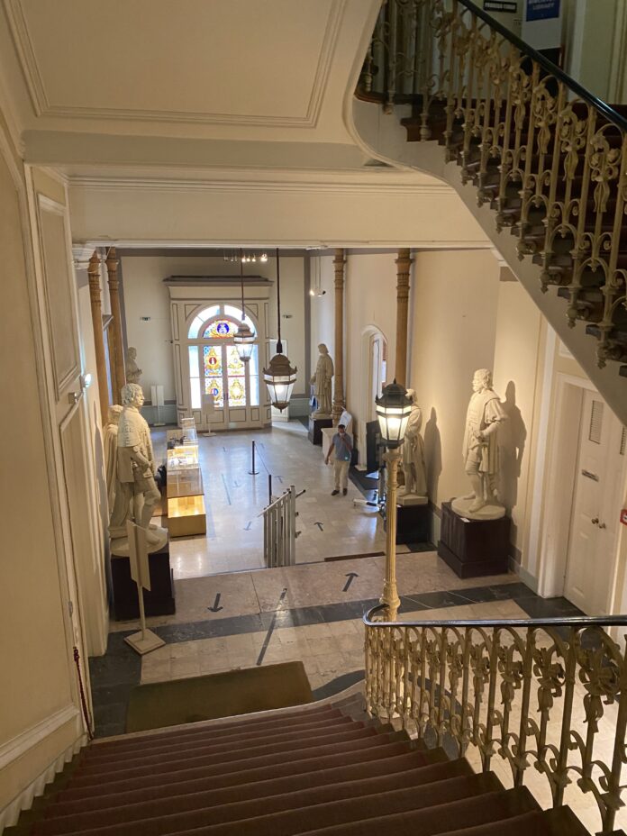 The headquarters of the Geographic Society of Lisbon and its museum are spread out over five floors with a grand staircase and elevator. The entrance hall displays statues of historical figures like Henry the Navigator and Pedro Álvares Cabral in addition to two 16th-century Italian globes showing the known world and constellations.